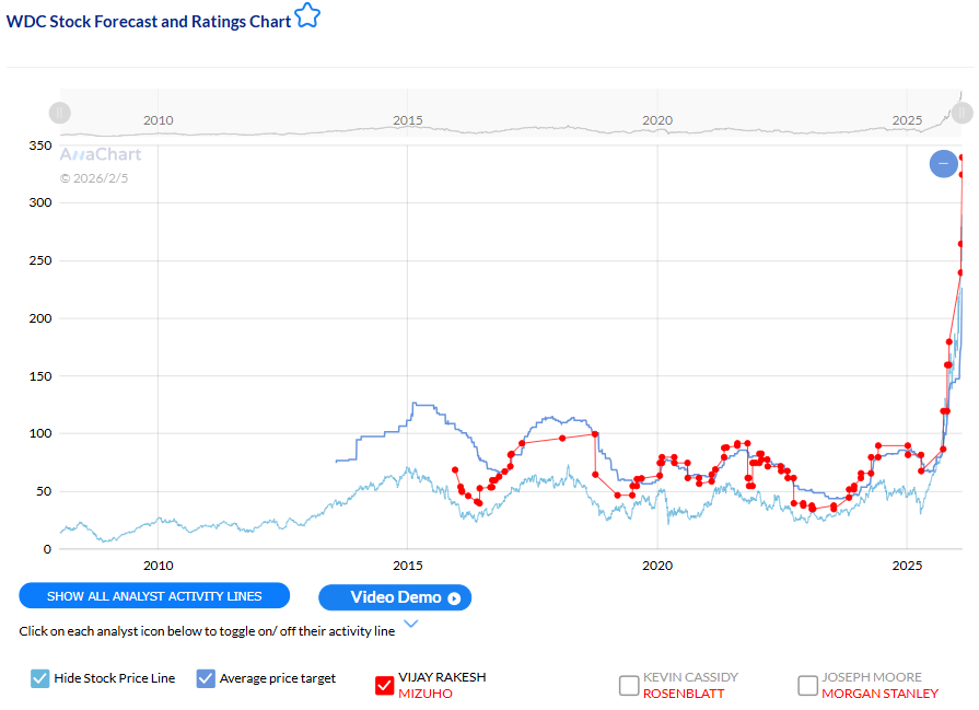 Among analysts tracked by AnaChart, Vijay Rakesh (Mizuho) has the current best track record on Western Digital, with a 100% price-target fulfillment ratio (43/43). His historical price targets have typically been reached within an average of 945 days.