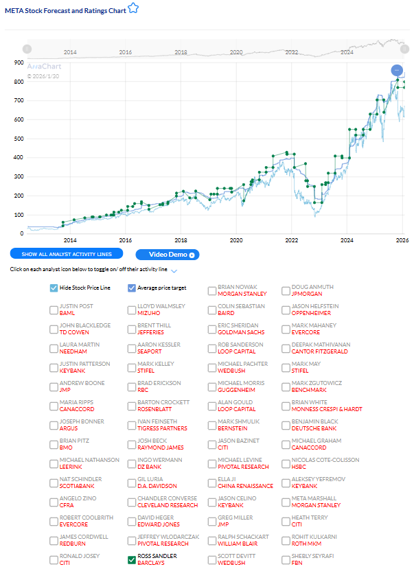 Among analysts tracked by AnaChart, Ross Sandler (Barclays) holds the strongest historical track record on Meta Platforms, with a 98.18% price-target fulfillment ratio (54/55). His historical price targets have typically been reached within an average of 251 days.