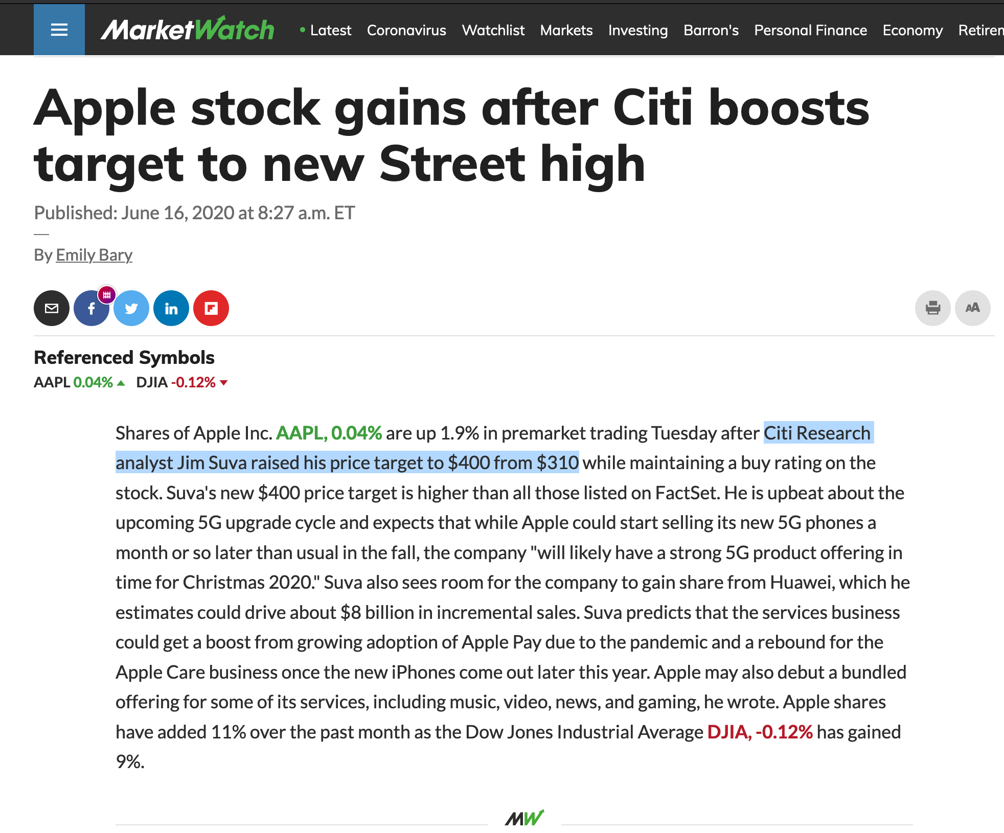 The GIF above shows that For over a decade, Jim Suva has been committed to the stock of Apple. Always expressing his expertise with positive predictions that kept price targets above its current valuation; he was simply adjusting expectations on June 16th 2020 when the stock climbed higher than projected.