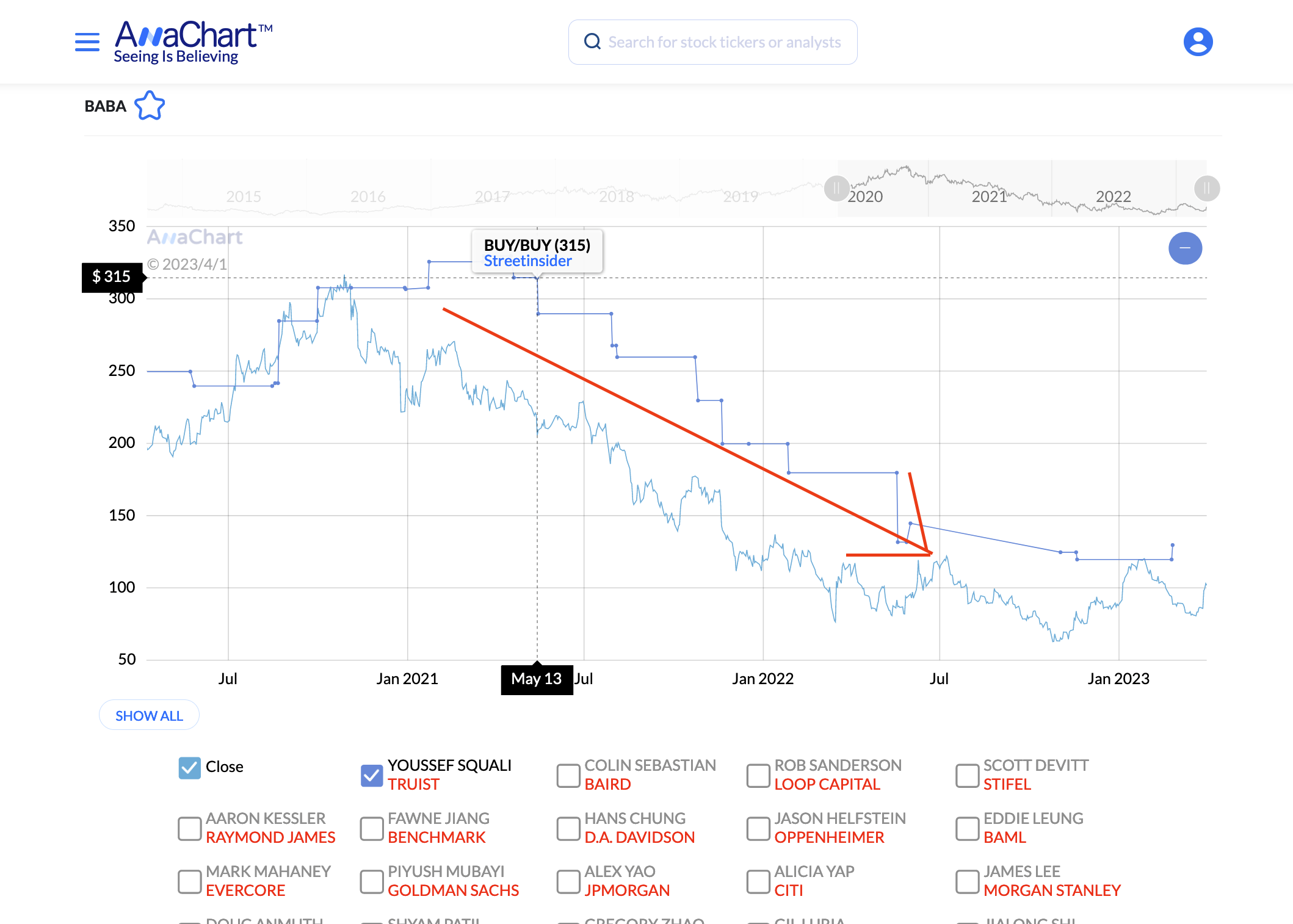 Another example is Truist analyst Youssef Squali who has been covering Ali Baba for the last eight years. During 2021 and 2022 the stock lost two thirds of its market value, the analyst kept his Buy rating for the entire duration but consistently adjust his price target lower.